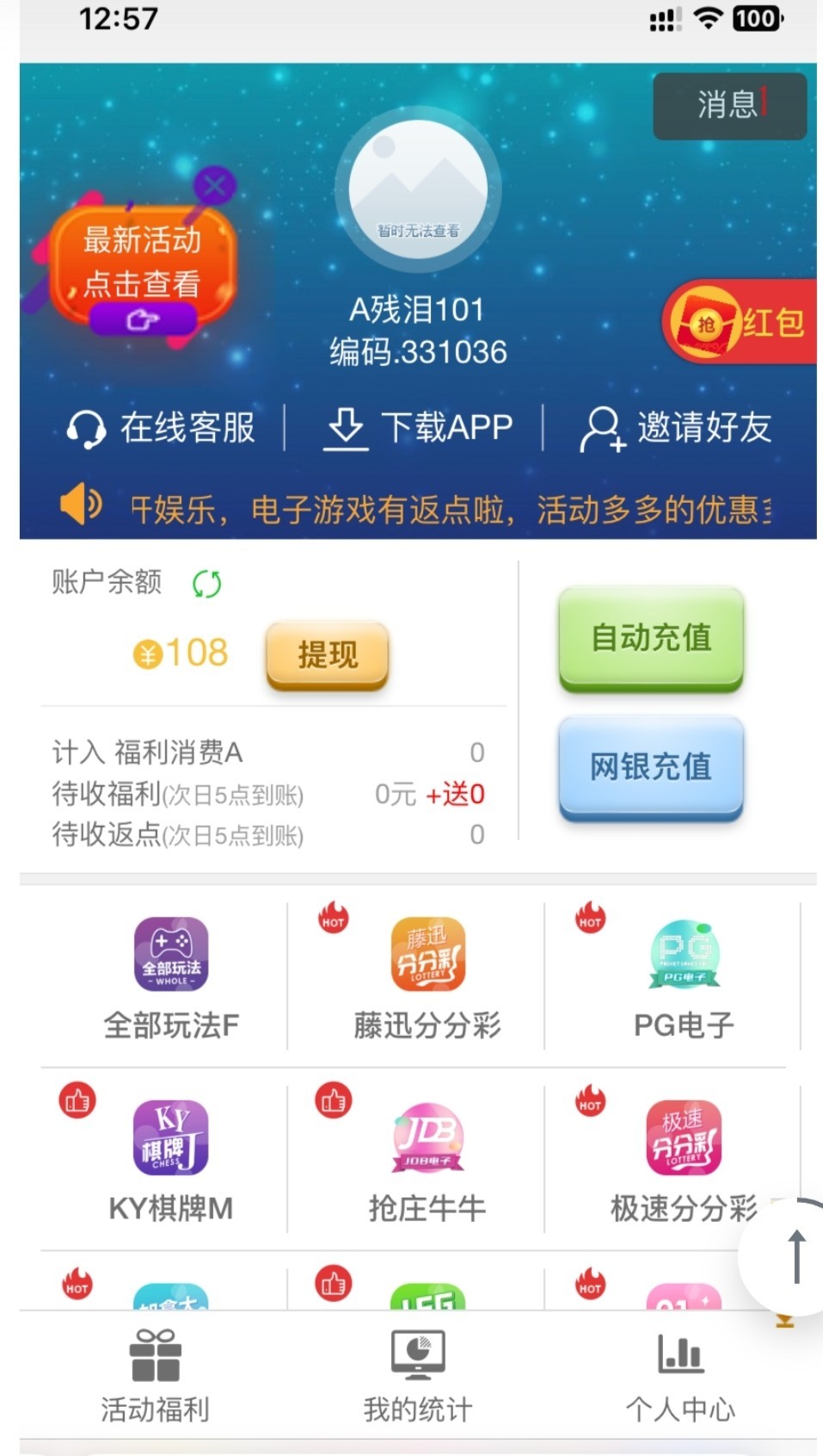 手机号登录,以前充值玩过的送108,我送了2个号,老用户找客服还能申请回归彩金,出款自测!