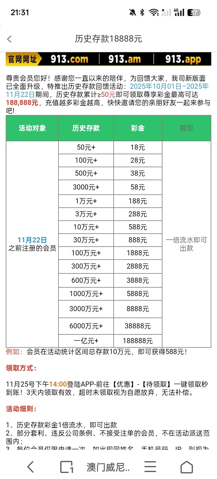 913历史充值过的明天下午2点可以领回馈