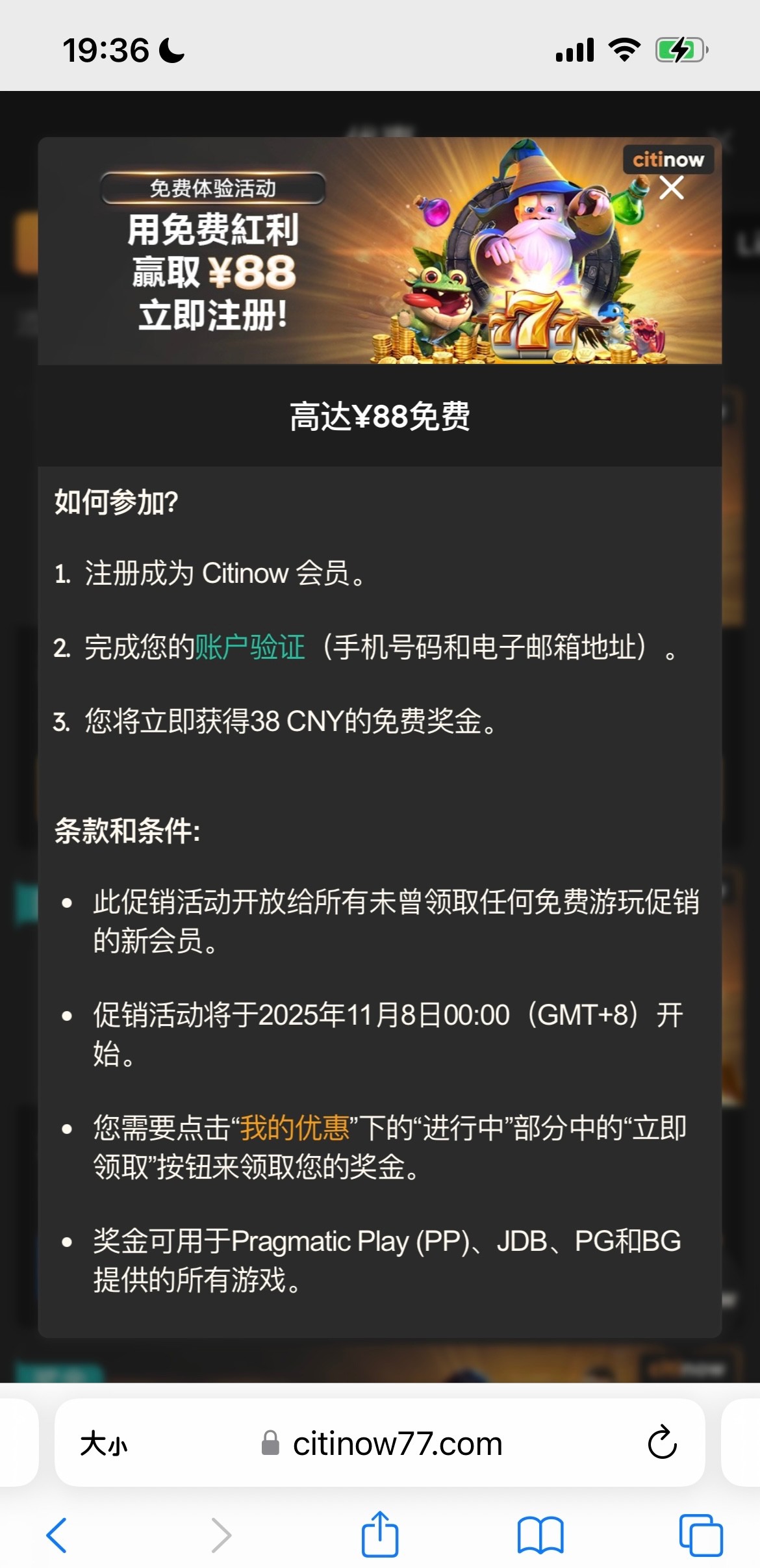 注册账号了手机号接收不到验证码的话找在线客服申请手动验证,客服会让你加客服微信验证就可以了,验证完在个人中心我的优惠里领取,要打190流水才能转出中心钱包,我就撸了一个号没打出来,老哥们加油,好像还没看到有人发过这个,祝各位大红,网址https://citinow77.com/cn/cn