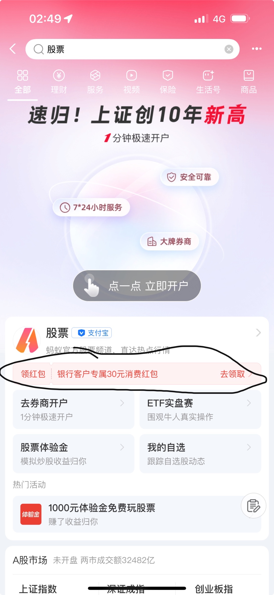 支付宝搜索股票进去就有工行开户绑定送30优惠卷无门槛的 开户好了自动到 审核基本在一天 不知道是不是只能工行