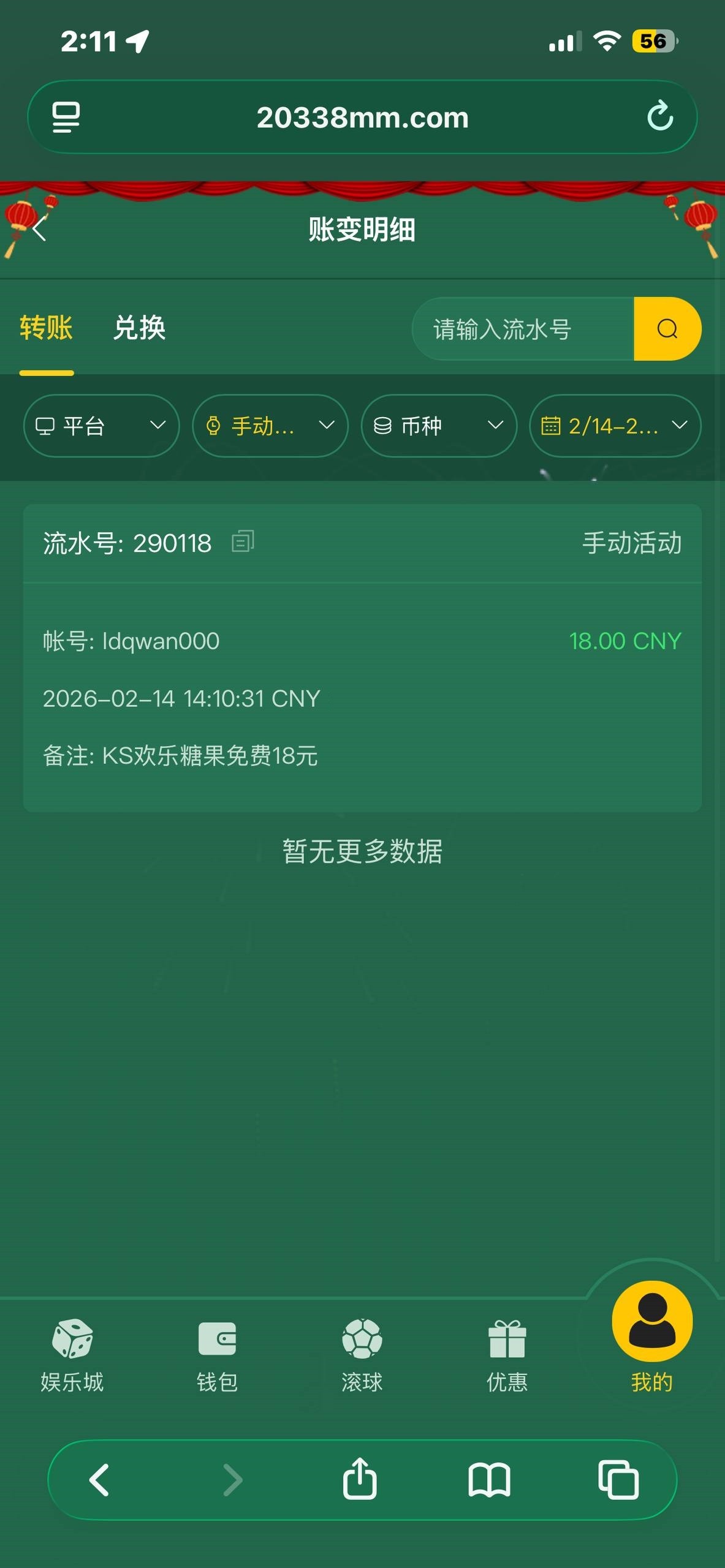 拿了上个月回馈打完后,有免费可以领18元回归,差点打出来,后面存了30打糖果博大炸水了,炸了500多,可惜只能提款288元