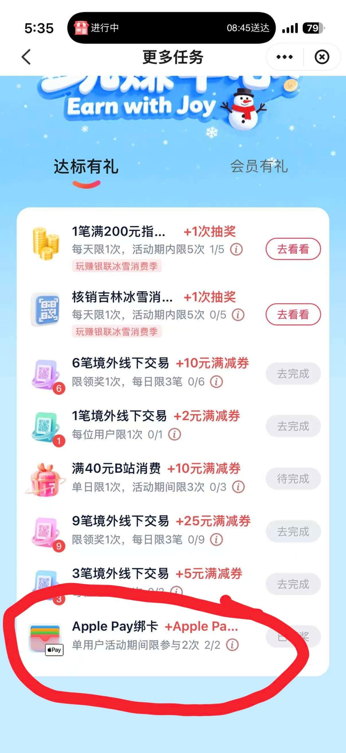 1.打开云闪付找到玩赚中心,更多任务下拉找到Apple pay绑卡